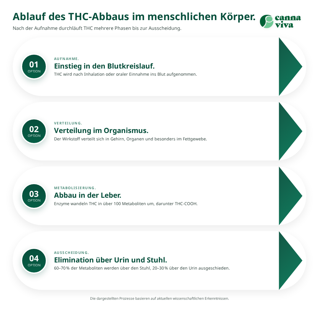 Nach dem Konsum von Cannabis wird THC schnell über die Lunge oder den Verdauungstrakt aufgenommen und gelangt in den Blutkreislauf. Von dort verteilt es sich im gesamten Körper und wird kontinuierlich in der Leber abgebaut. Dabei entstehen verschiedene Stoffwechselprodukte, die sogenannten Metaboliten, von denen insbesondere THC-COOH für Drogentests relevant ist.[1] Da THC fettlöslich ist, lagert es sich bevorzugt im Fettgewebe ein und wird nur langsam wieder freigesetzt, was die verlängerte Nachweisbarkeit erklärt.