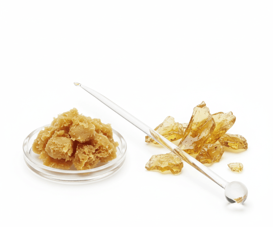 Shatter hingegen ist ein glasartiger, transluzenter Extrakt mit einer harten, zerbrechlichen Struktur. Der Name leitet sich von der Eigenschaft ab, bei Raumtemperatur wie Glas zu “zersplittern”. Diese Konsistenz entsteht durch einen langsameren, ungestörten Aushärtungsprozess ohne Rühren oder Schlagen.