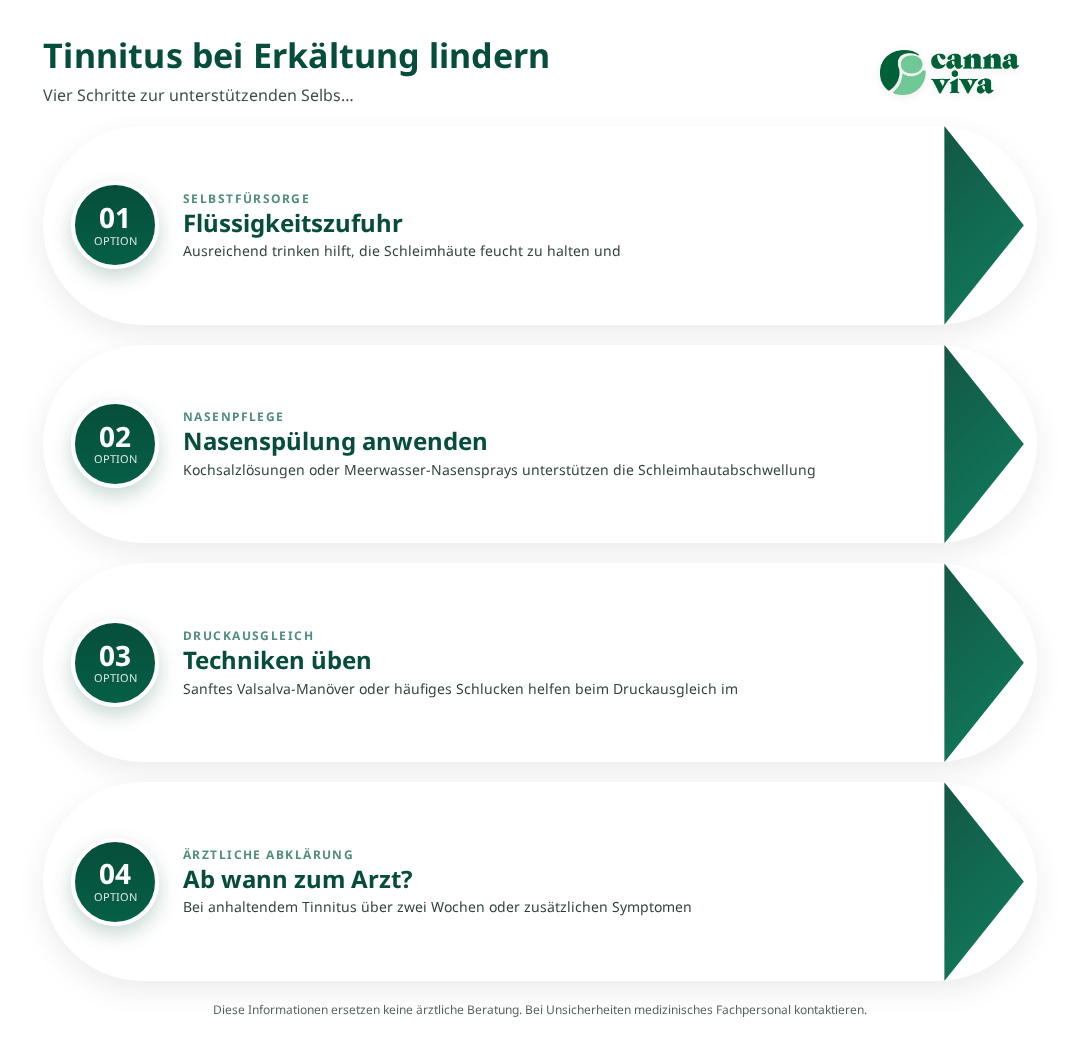 Neben der spezifischen Behandlung können verschiedene unterstützende Massnahmen dazu beitragen, die Beschwerden zu lindern und die Heilung zu fördern.[6] Ausreichend Schlaf und Erholung sind wichtig, damit das Immunsystem die Erkältung bekämpfen kann. Stress kann Tinnitus verstärken, weshalb Entspannungstechniken wie Meditation oder progressive Muskelentspannung hilfreich sein können.