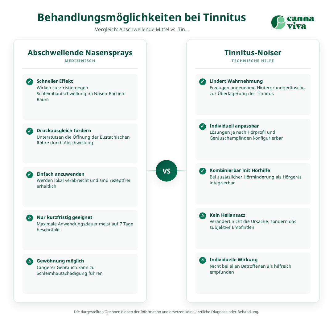 Die Behandlung von erkältungsbedingtem Tinnitus zielt darauf ab, die zugrundeliegende Ursache zu bekämpfen und die Symptome zu lindern. Im Vordergrund steht die Behandlung der Erkältung selbst sowie die Wiederherstellung der normalen Belüftung des Mittelohrs.
