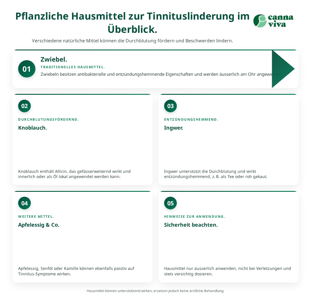 Knoblauch enthält verschiedene schwefelhaltige Verbindungen, die durchblutungsfördernd wirken können. Für die äusserliche Anwendung wird eine Knoblauchzehe zerdrückt und mit etwas Olivenöl vermischt. Das Öl wird leicht erwärmt und nach dem Abkühlen vorsichtig am äusseren Gehörgang aufgetragen. Die innerliche Einnahme von ein bis zwei rohen Knoblauchzehen täglich kann ebenfalls unterstützend wirken.