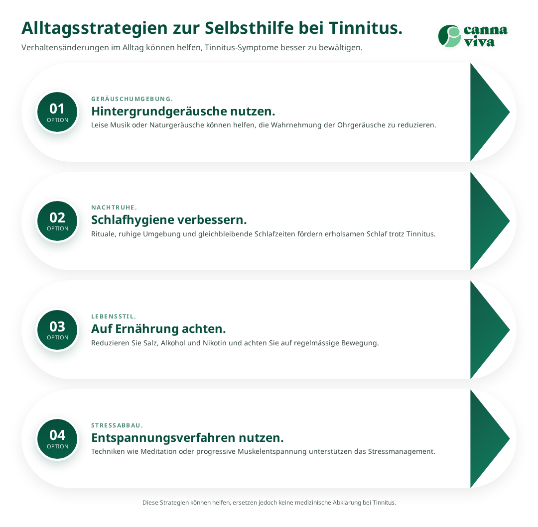 Neben gezielten Behandlungsmassnahmen können verschiedene Alltagsstrategien dabei helfen, besser mit Tinnitus zu leben und die Symptome zu lindern.[6] Diese Ansätze erfordern keine speziellen Hilfsmittel, sondern können durch bewusste Verhaltensänderungen umgesetzt werden.