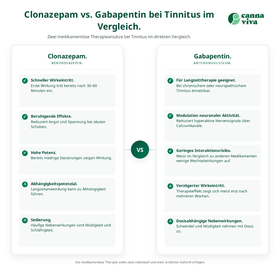 Clonazepam wirkt als GABA-Rezeptor-Agonist und kann die übermässige neuronale Erregung im auditorischen System reduzieren.[1] Dieser Mechanismus macht es besonders wirksam bei akuten Tinnitus-Schüben, da es die Hyperaktivität der Nervenzellen dämpft.
