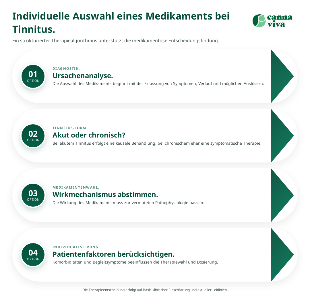 Die Auswahl des besten Medikaments gegen Tinnitus folgt einem strukturierten Algorithmus, der verschiedene Patientenfaktoren berücksichtigt. Zunächst erfolgt eine gründliche Anamnese zur Identifikation möglicher Ursachen und auslösender Faktoren. Die Unterscheidung zwischen akutem und chronischem Tinnitus ist dabei von zentraler Bedeutung.