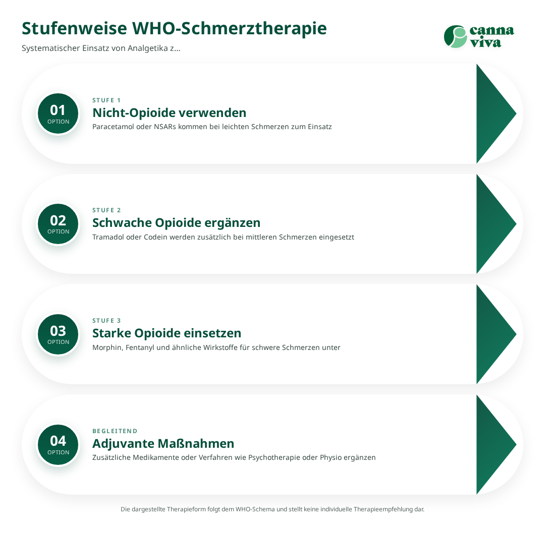 - Stufe 1: Nicht-Opioide (Paracetamol, NSARs) bei leichten Schmerzen