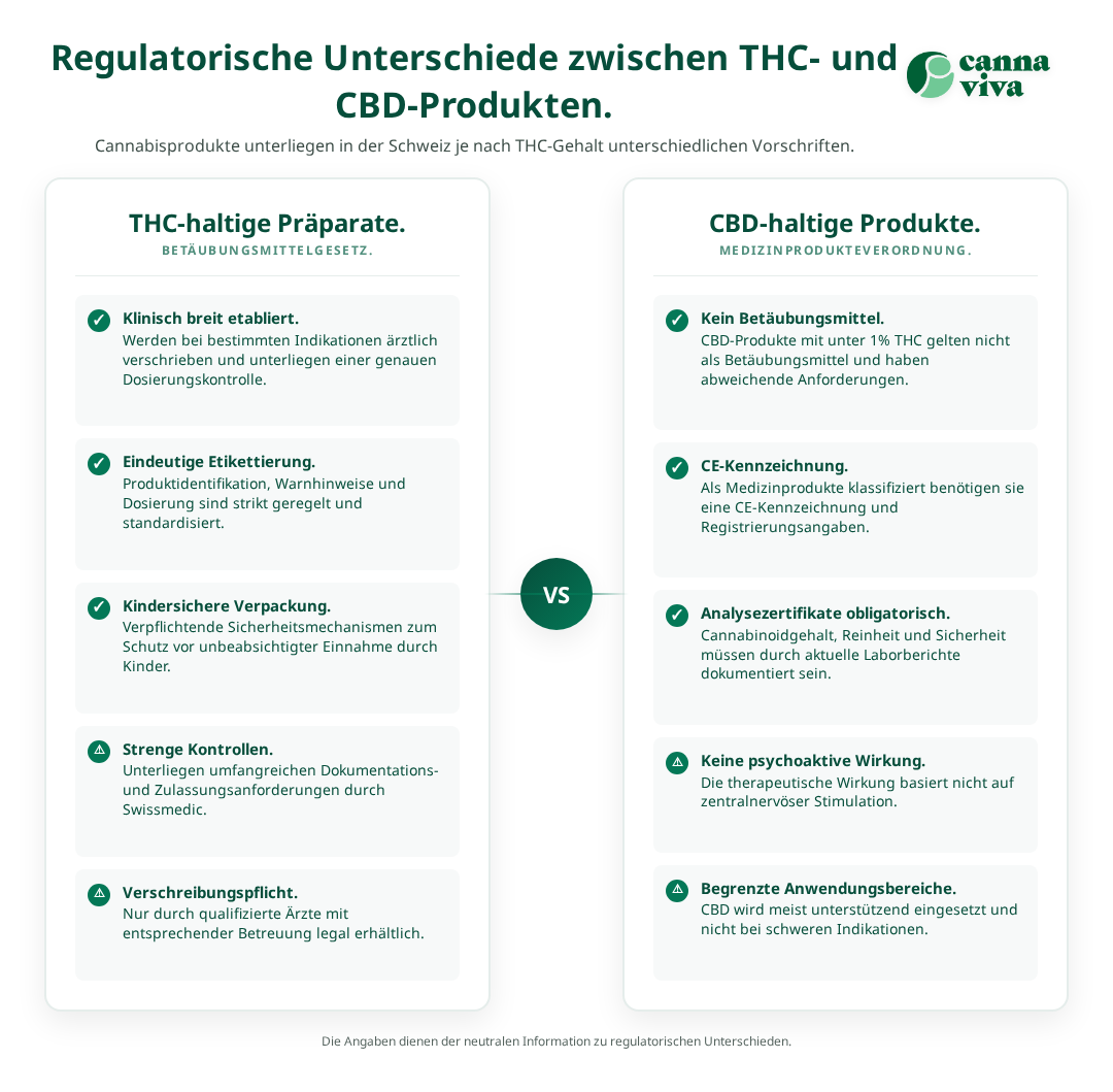 - **Medizinproduktekennzeichnung:** CE-Kennzeichnung und Registrierungsnummer des Herstellers sind obligatorisch. Die Wirkung wird nicht pharmakologisch, sondern durch unterstützende Cannabinoidwirkung definiert.