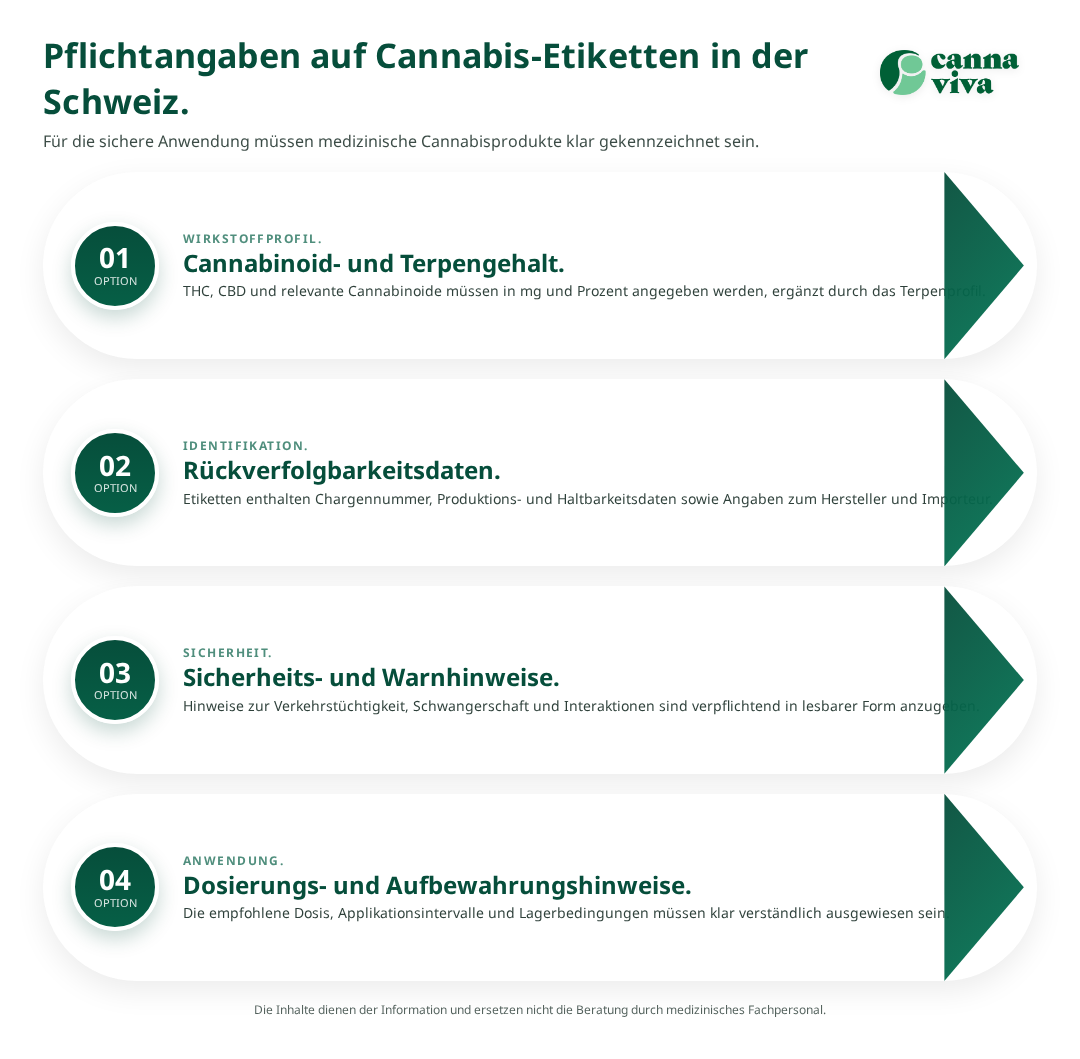 Die Etikettierung medizinischer Cannabisprodukte folgt standardisierten Vorgaben, die sowohl Pflichtangaben als auch optionale Informationen umfassen. Diese Systematik gewährleistet Einheitlichkeit und erleichtert Ärzten, Apothekern und Patienten den sicheren Umgang.