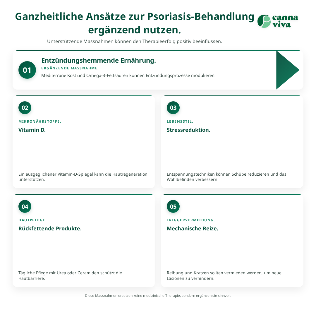 Cannaviva unterstützt Sie bei der ganzheitlichen Betrachtung Ihrer Hautgesundheit. Neben den bewährten dermatologischen Therapien können auch alternative Behandlungsansätze bei entzündlichen Hauterkrankungen eine wertvolle Ergänzung darstellen. Unser Expertenteam berät Sie gerne über individuelle Therapieoptionen und hilft dabei, die für Sie passende Behandlungsstrategie zu entwickeln.
