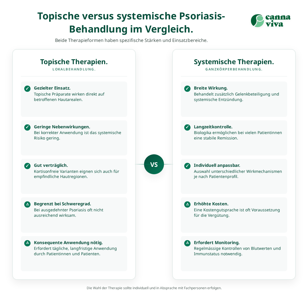 Die Behandlung der Psoriasis-Arthritis erfolgt oft mit den gleichen systemischen Medikamenten wie die Hautpsoriasis, insbesondere Biologika zeigen hier sehr gute Erfolge. Dies unterstreicht den Vorteil einer systemischen Therapie, die beide Manifestationen der Erkrankung gleichzeitig behandelt.