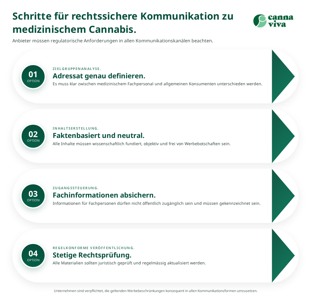 Obwohl direkte Produktwerbung an Patienten nicht erlaubt ist, gibt es durchaus legale Wege, Patienten über medizinisches Cannabis zu informieren.[4] Diese müssen jedoch sorgfältig von werbenden Inhalten abgegrenzt werden und sollten immer über qualifizierte Fachpersonen erfolgen.